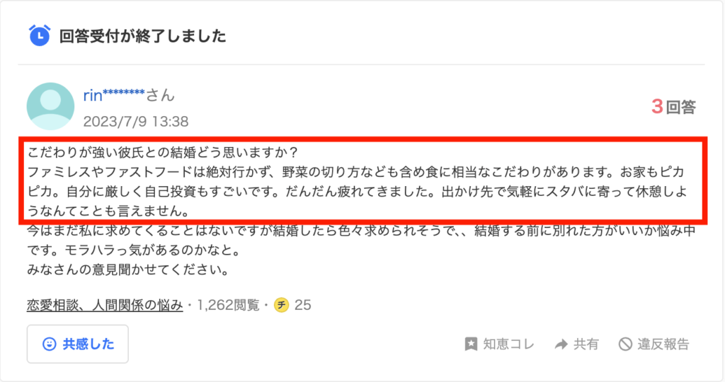 こだわりが強い彼氏との結婚どう思いますか? ファミレスやファストフードは絶対行かず、野菜の切り方なども含め食に相当なこだわりがあります。お家もピカピカ。自分に厳しく自己投資もすごいです。だんだん疲れてきました。出かけ先で気軽にスタバに寄って休憩しようなんてことも言えません。