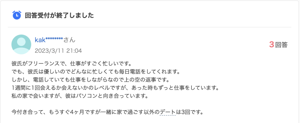 彼氏がフリーランスで、仕事がすごく忙しいです。 でも、彼氏は優しいのでどんなに忙しくても毎日電話をしてくれます。 しかし、電話していても仕事をしながらなので上の空の返事です。 1週間に1回会えるか会えないかのレベルですが、あった時もずっと仕事をしています。 私の家で会いますが、彼はパソコンと向き合っています。 今付き合って、もうすぐ4ヶ月ですが一緒に家で過ごす以外のデートは3回です。
