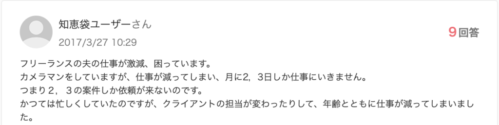 フリーランスの夫の仕事が激減、困っています。 カメラマンをしていますが、仕事が減ってしまい、月に2,3日しか仕事にいきません。 つまり2,3の案件しか依頼が来ないのです。