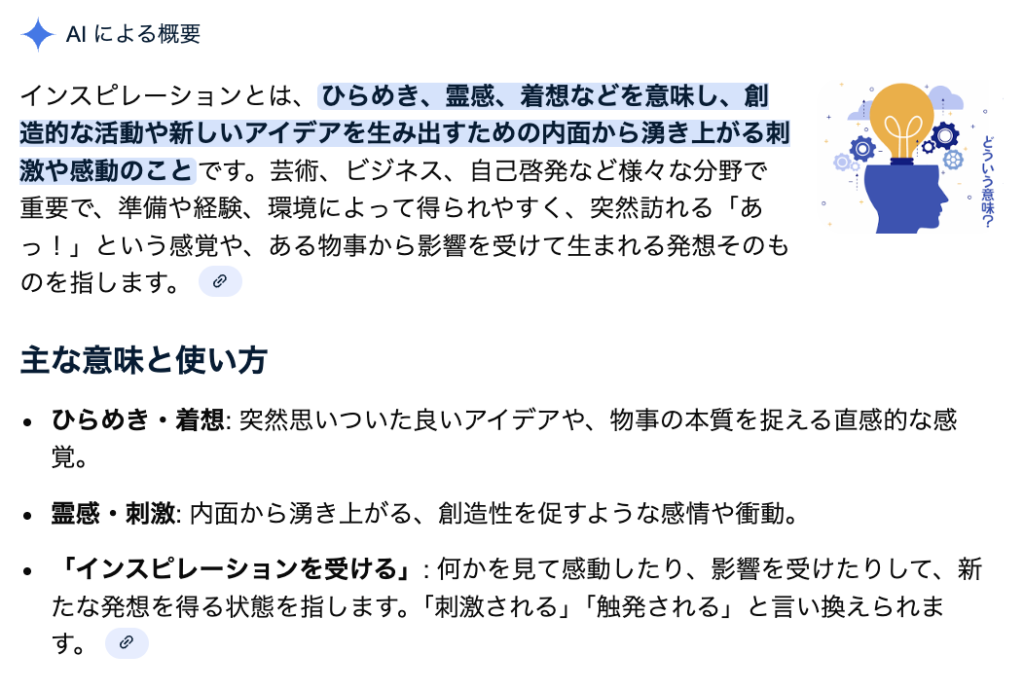 インスピレーションとは、ひらめき、霊感、着想などを意味し、創造的な活動や新しいアイデアを生み出すための内面から湧き上がる刺激や感動のことです。芸術、ビジネス、自己啓発など様々な分野で重要で、準備や経験、環境によって得られやすく、突然訪れる「あっ!」という感覚や、ある物事から影響を受けて生まれる発想そのものを指します。
